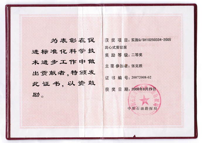 • 剪切泵獲獎(jiǎng)證書